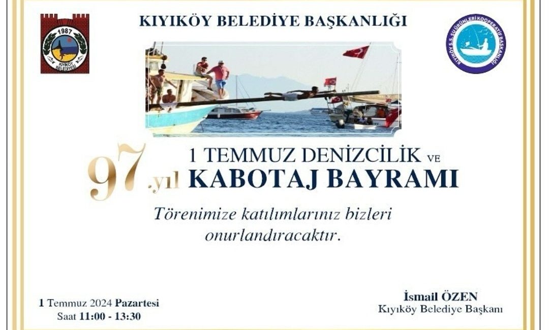 1 Temmuz Denizcilik ve Kabotaj Bayramının 97.yıl kutlama töreni Pazartesi günü saat 11.00-13.00’da Kıyıköy Belediyesi öncülüğünde gerçekleştirilecektir. Tüm halk davetlidir.