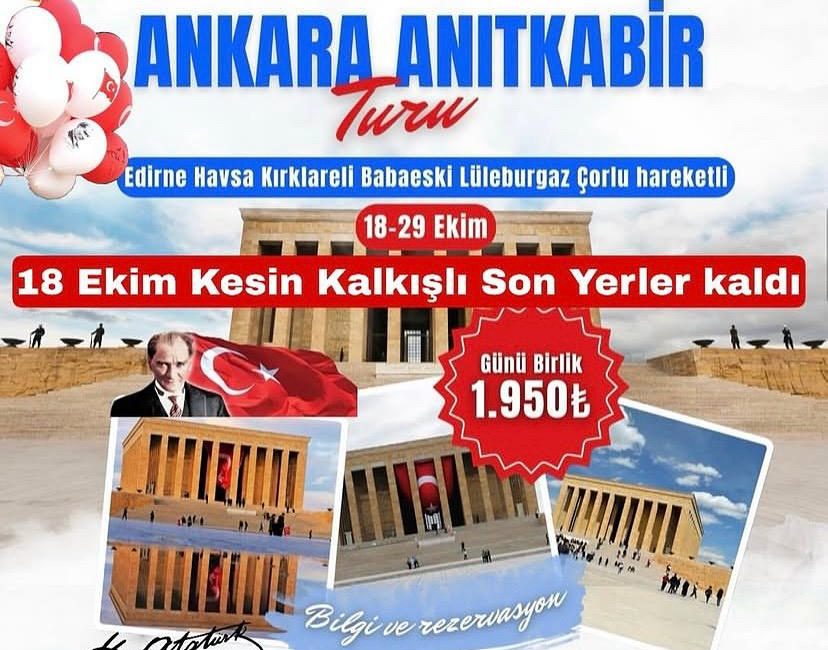 18 Ekim Cumartesi günü düzenlenen günübirlik Anıtkabir ve Ankara turuna katılabilirsiniz. Tur, Edirne, Kırklareli, Babaeski, Lüleburgaz ve Çorlu’dan hareket edecek ve Ankara Kalesi, Anadolu Medeniyetleri Müzesi, Kurtuluş Savaşı Müzesi, Cumhuriyet Müzesi, Ankamall AVM ve Anıtkabir’i kapsayacak. Fiyata ulaşım, çevre gezileri, araç içi ikramlar, rehberlik ve sigorta dahil olup, müze girişleri ve yemekler hariçtir.