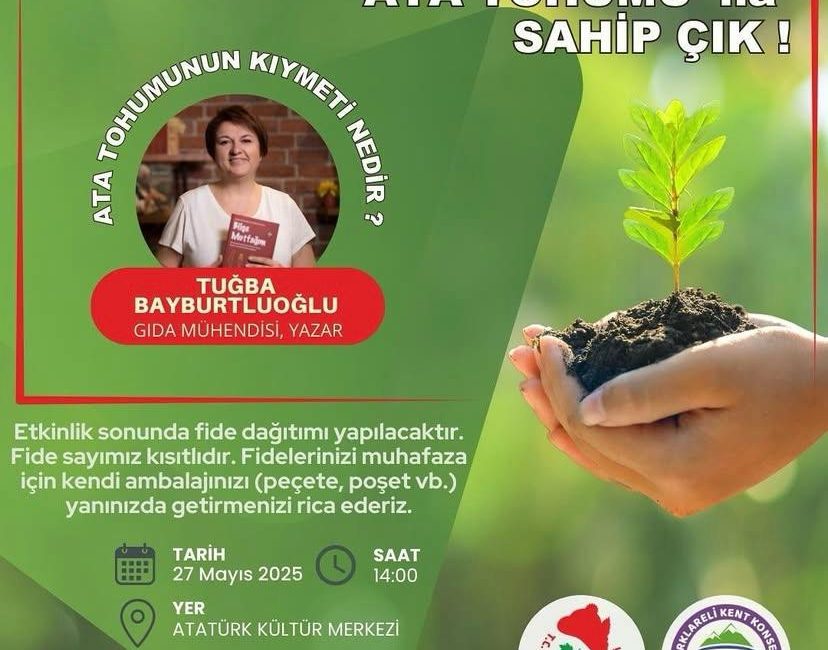 Kırklareli Belediyesi ve Kırklareli Kent Konseyi’nin iş birliğiyle düzenlenen etkinlikte, gıda mühendisi ve yazar Tuğba Bayburtluoğlu “Ata Tohumunun Kıymeti Nedir?” başlıklı söyleşisiyle Atatürk Kültür Merkezi’nde vatandaşlarla buluşacak. 27 Mayıs 2025 Salı günü saat 14.00’te gerçekleşecek etkinlikte, geleneksel tarım ve yerli tohumların önemi ele alınacak. Bayburtluoğlu, ata tohumlarının besin değeri, doğayla uyumu ve gelecek nesiller için taşıdığı anlam üzerine bilgiler paylaşacak. Program sonunda sınırlı sayıda fide dağıtımı yapılacak olup, katılımcıların fideleri güvenle taşıyabilmeleri için yanlarında peçete veya poşet gibi basit ambalaj malzemeleri getirmeleri önerilmektedir.