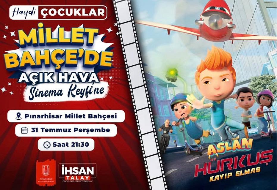 Film Pınarhisar Millet Bahçesi’nde 31 Temmuz Perşembe akşamı saat 21.30’da düzenlenecek açık hava sinema etkinliğinde, çocukların severek izlediği “Aslan Hürkuş Kayıp Elmas” filmi gösterilecek. Etkinliğe katılan tüm çocuklara patlamış mısır ikram edilecek olup, etkinlik ücretsizdir.