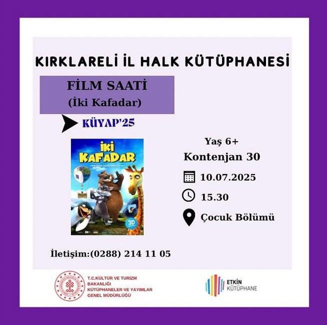 Kırklareli İl Halk Kütüphanesi’nde 10 Temmuz 2025 Çarşamba günü saat 15.30’da çocuklara özel “İki Kafadar” adlı animasyon filmi gösteriliyor. 6 yaş ve üzeri çocukların katılımına açık olan etkinlik, kütüphanenin çocuk bölümünde gerçekleştirilecek ve kontenjan 30 kişiyle sınırlı. Eğlenceli bir sinema deneyimi sunmak isteyen kütüphane, tüm minik sinemaseverleri bekliyor.