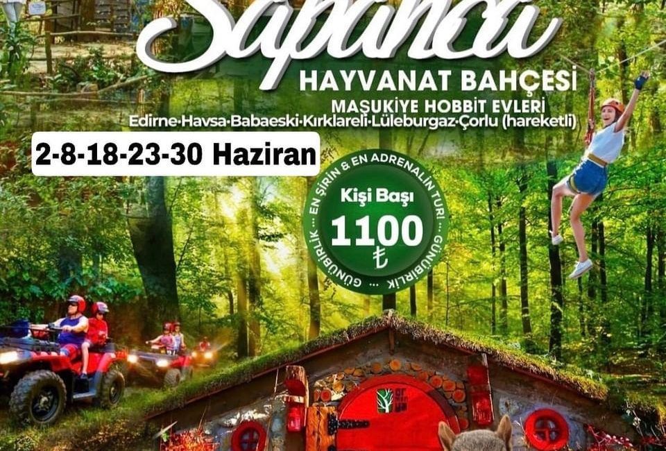 18 Haziran tarihinde Gezideyiz Travel öncülüğünde ”Günübirlik Ormanya Hobbit Evleri Hayvanat Bahçesi Sapanca Maşukiye Turu” gerçekleştirilecektir. Etkinliğin ücreti 1100₺’dir. Kırklareli merkez için araç hareket noktası Kırklareli Eski Rektörlük Önü olup, saat 05.00’da araç hareket edecektir.