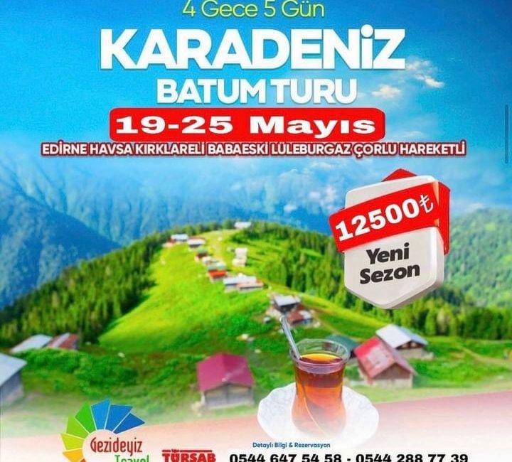 19-25 Mayıs tarihlerinde Gezideyiz Travel öncülüğünde ”Karadeniz,Batum Turu” gerçekleştirilecektir. Etkinliğin ücreti 12500₺’dir. Kırklareli merkez için araç hareket noktası Kırklareli Eski Rektörlük Önü olup, saat 20.00’da araç hareket edecektir.