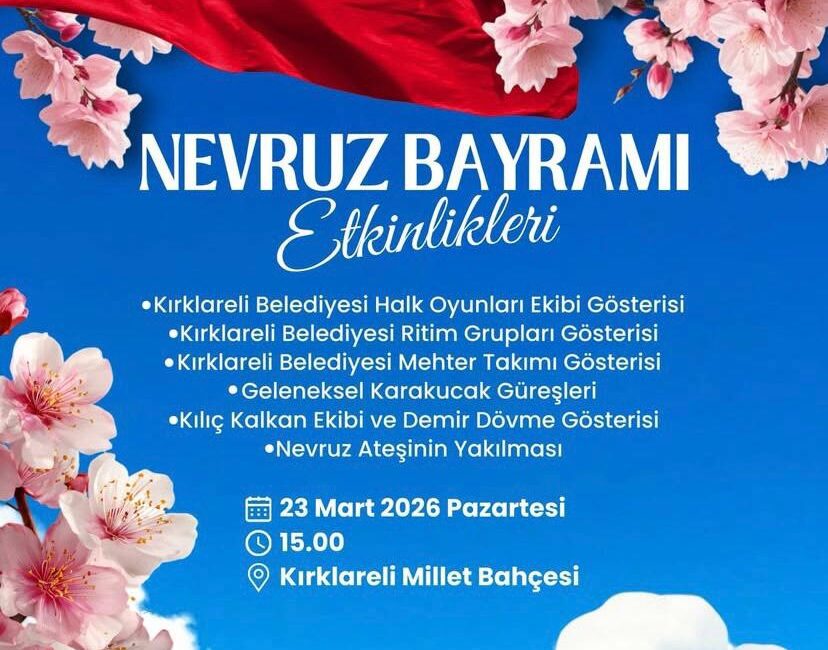 23 Mart 2026 Pazartesi günü saat 15.00’te Kırklareli Millet Bahçesi’nde düzenlenecek Nevruz Bayramı Etkinlikleri kapsamında halk oyunları, ritim grupları ve mehteran gösterileri, geleneksel karakucak güreşleri, kılıç kalkan ve demir dövme gösterileri ile Nevruz ateşinin yakılmasıyla baharın coşkusu hep birlikte kutlanacaktır. 🌸