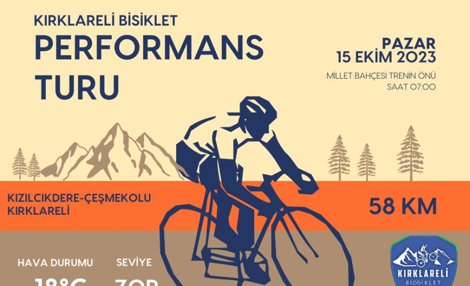 Pazar Performans Bisiklet Turu 15 Ekim Pazar Güzergah : KIRKLARELİ, ÇEŞMEKOLU ÇEŞMEKOLU, KIRKLARELİ Mesafe : 58 km Hava : 18° Seviye : Zor Buluşma Yeri, Saati : Millet Bahçesi Trenin Önü 07:00 Tur şehir, mtb ve yol bisiklet çeşitleri için...