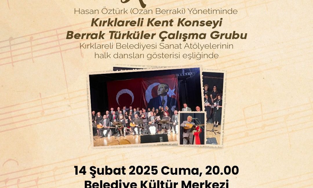 🎶 Kırklareli Kent Konseyi ve Kırklareli Belediyesi işbirliğiyle düzenlenen Lozan Mübadelesi ve Mübadiller Günü 102. Yıl Anma Programı, 14 Şubat saat 20:00’de Rektörlük Kültür Merkezi’nde gerçekleşiyor. Kırklareli Kent Konseyi Berrak Türküler Çalışma Grubu, Kırklareli Sanat Akademileri ve şef Hasan Öztürk (Ozan Berraki) yönetiminde “Rumeli Göç Türküleri” ile sınırların ardında kalan türkülerimiz, danslarımız ve ağıtlarımız bu özel gecede yeniden canlanıyor.