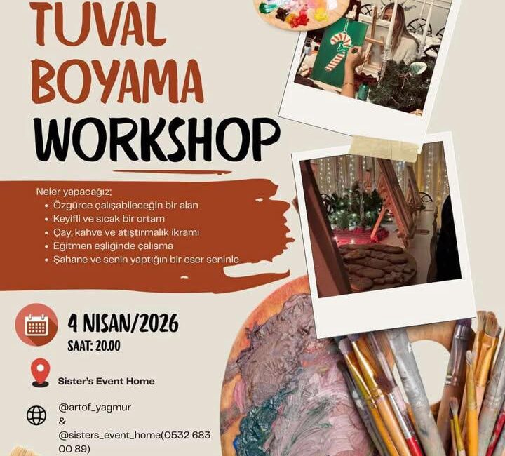 🎨 4 Nisan 2026 tarihinde saat 20.00’de Sister’s Event Home’de düzenlenecek Tuval Boyama Workshop’unda katılımcılar, tamamen kendi hayal güçleri doğrultusunda tuvallerini renklendirirken sıcak çay ve kahve eşliğinde keyifli ve dinlendirici anlar yaşayacak, ister arkadaşları ister sevdikleriyle birlikte katılabilecekleri bu etkinlik sonunda eserlerini paketli şekilde teslim alacaklardır; sınırlı kontenjanla gerçekleşecek workshop için detaylı bilgi ve rezervasyon 0532 683 00 89 numaralı telefon üzerinden sağlanmaktadır.