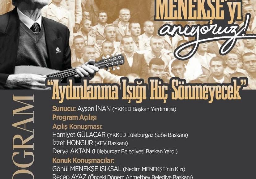 Lüleburgaz Belediyesi, Köy Enstitüleri’nin hiç sönmeyen aydınlanma meşalesi Nedim Menekşe öğretmenimizi aramızdan ayrılışının yıl dönümünde, ismini yaşattıkları Nedim Menekşe Parkı’nda anıyor. 28 Mart saat 16.00’da düzenlenecek anma programına tüm halkımız davetlidir. İletişim: luleburgazbld