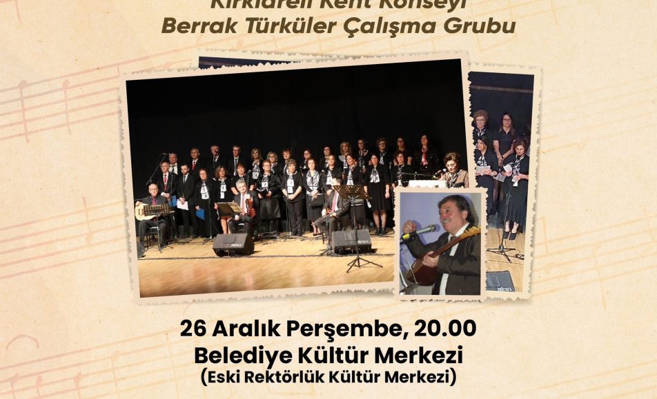 Hasan Öztürk (Ozan Berraki) yönetimindeki Kırklareli Kent Konseyi Berrak Türküler Çalışma Grubu, Anadolu’nun zengin kültürünü ve gurbetin hüzün dolu ezgilerini yansıtan muhteşem bir konserle sizlerle buluşuyor. Sıla hasretini türkülerin büyüsüyle hissettirecek bu özel gece, unutulmaz bir müzik ziyafeti sunmaya hazırlanıyor....