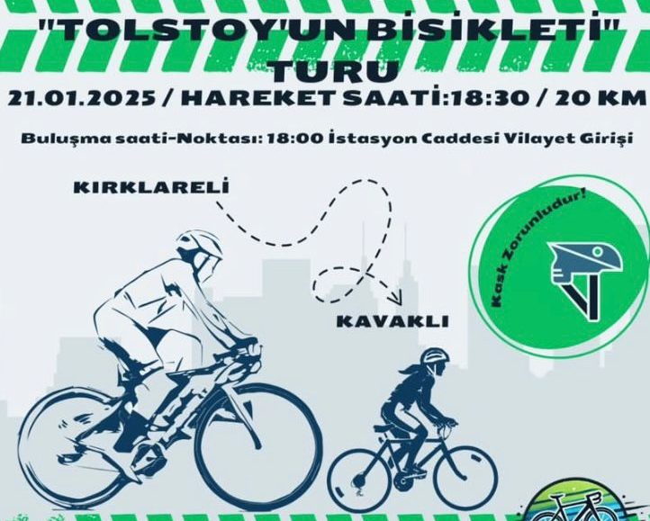 🚴♂️ “Tolstoy’un Bisiklet Turu” Kırkpedal ekibiyle birlikte Eriklice’ye pedallıyoruz.06 Mayıs 2025 Salı günü, saat 19.30’da İstasyon Caddesi’nde buluşuyor, 20.00’de yola çıkıyoruz.Kolay seviye bu 8 km’lik turda güvenlik ekipmanları zorunludur. Kask, aydınlatma ve reflektör yeleğinizi unutmayın. İletişim: @kirkpedal