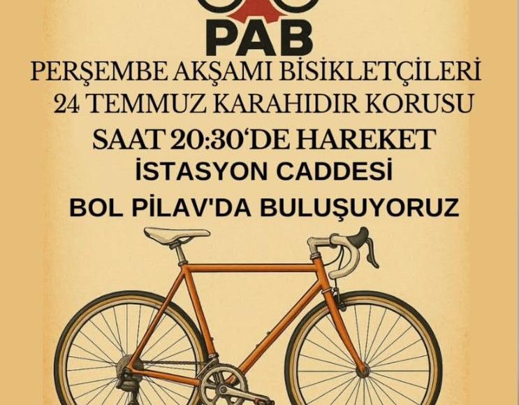 24 Temmuz Perşembe akşamı saat 20.30’de İstasyon Caddesi’nden hareketle Karahıdır Korusu rotasında bisiklet turu yapıyoruz! Kask, aydınlatma ve reflektör zorunludur. 18 yaş altı sadece ebeveynle katılabilir. Güvenli ve keyifli bir tur için kurallara uyalım. İletişim: @pab_kirklareli