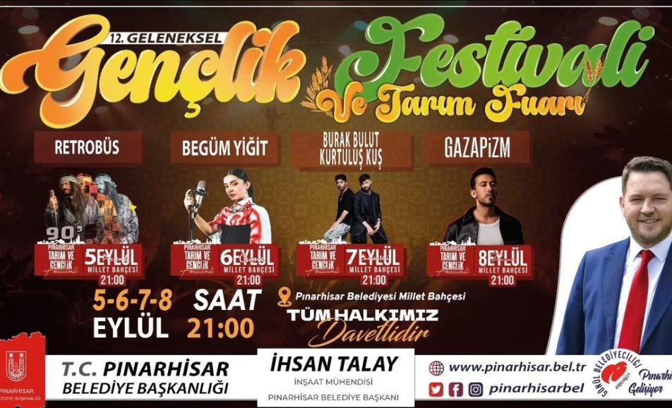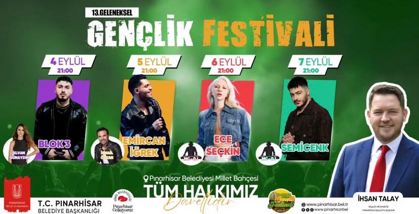 Pınarhisar’da festival heyecanı başlıyor! Pınarhisar Belediyesi’nin bu yıl 13.’sünü düzenlediği Geleneksel Gençlik Festivali, 4–7 Eylül tarihlerinde Blok 3, Emircan İğrek, Ece Seçkin ve Semicenk konserleriyle müzik dolu dört gece sunuyor. Etkinlikler her akşam saat 21.00’de Pınarhisar Belediyesi Millet Bahçesi’nde. İletişim: @pinarhisarbel