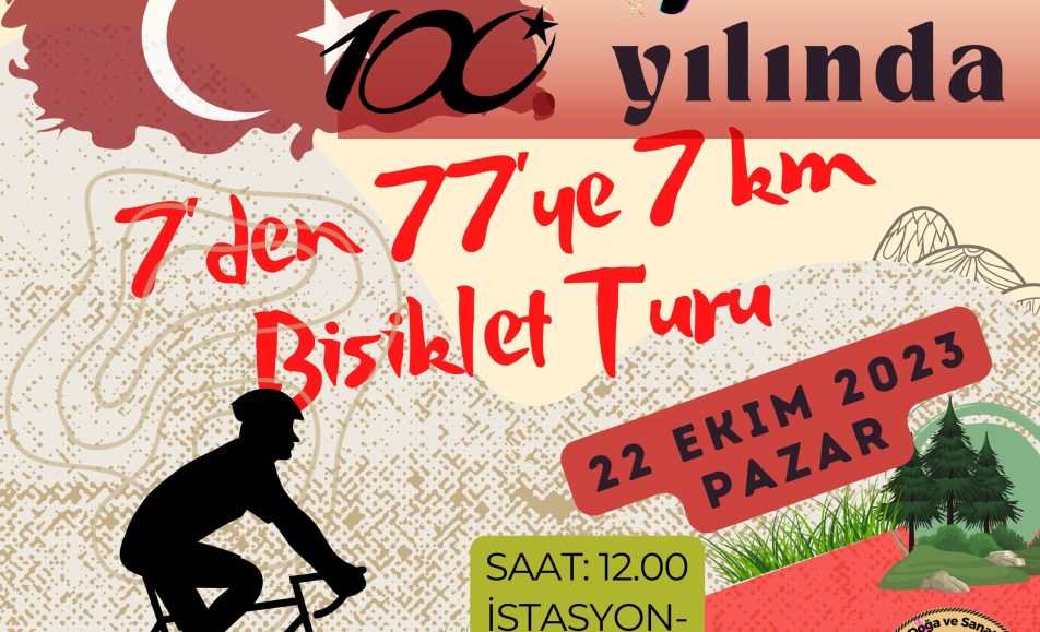 Türkiye Cumhuriyeti’nin 100. yılında 7’den 77’ye 7 kilometre bisiklet turu. 🇹🇷🚴♀️ 📆 22 Ekim 2023 Pazar 📍 Millet Bahçesi Tren Önü ⏰ 12:00