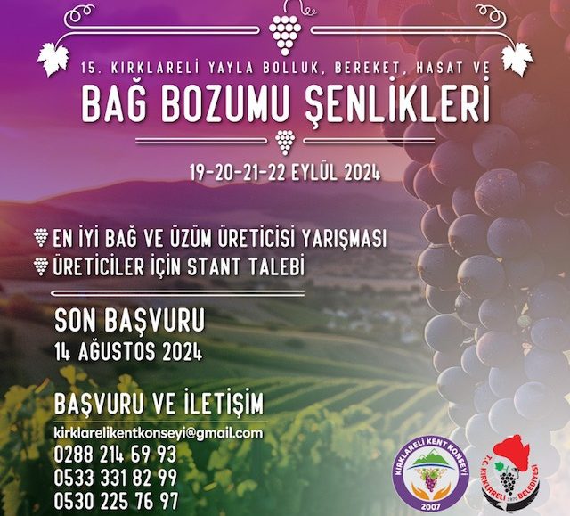 15. Kırklareli Yayla Bolluk, Bereket, Hasat ve Bağ Bozumu Şenlikleri Başlıyor! 🍇 Kırklareli’nin bereketini ve birliğini kutladığımız bu özel günlerde, omuz omuza yürüyelim, gönüllerimizde dostluğu büyütelim. 🌿💫 📅 19 Eylül 2024, Perşembe📍 Başlangıç Noktası: Dingiloğlu Parkı Önü⏰ 14:00 İletişim:@kirklarelibelediyesi