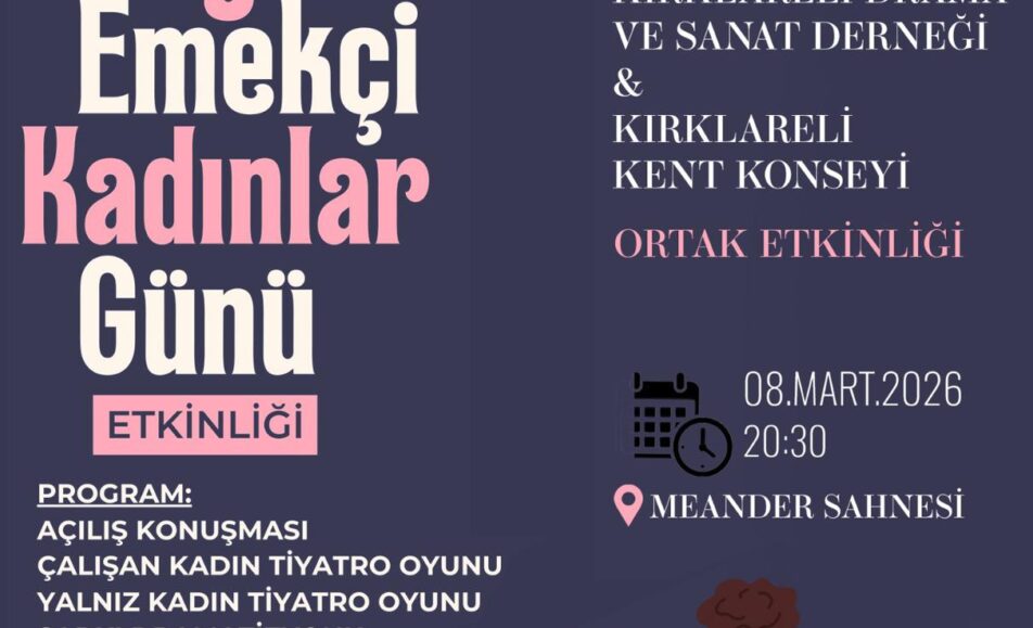 Kırklareli Kent Konseyi ve Kırklareli Drama ve Sanat Derneği iş birliğiyle hazırlanan programda, çalışan, üreten, yetiştiren ve hayallerinin peşinden cesaretle giden kadınların hikâyeleri sahneye taşınıyor. Kadınların gücünü ve emeğini vurgulayan bu anlamlı etkinlik 8 Mart 2026’da saat 20.30’da MEANDER Sahne’de...