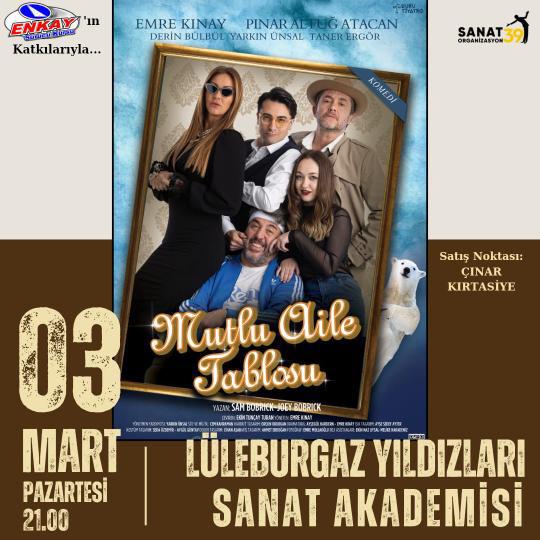 Tüm Türkiye’de kapalı gişe oynayan Mutlu Aile Tablosu, Enkay Sürücü Kursu katkılarıyla ilk kez Lüleburgaz’da seyircisiyle buluşuyor. 3 Mart Pazartesi saat 21:00’de Lüleburgaz Yıldızları Sanat Akademisi’nde gerçekleşecek bu özel gösteri için biletler Çınar Kırtasiye ve www.biletinial.com adresinde satışta. İletişim: @sanatorganizasyon39
