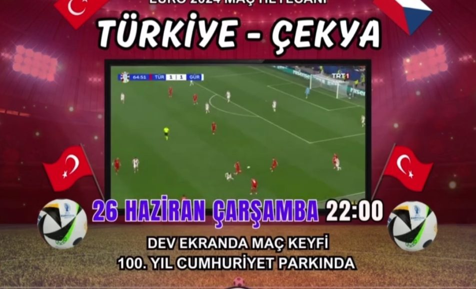 26 Haziran Çarşamba günü, saat 22.00’da, 100.Yıl Cumhuriyet Park’ında Türkiye-Çekya maçı yayınlanacaktır. Tüm halk davetlidir.
