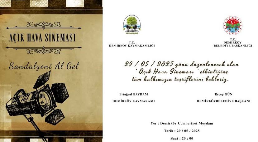 05.09.2025 Cuma akşamı saat 20.00’de, Cumhuriyet Meydanı 100. Yıl Parkı’nda Demirköy Belediyesi’nin düzenlediği Açık Hava Sinema etkinliğinde buluşuyoruz. Sandalyeni al, sevdiklerini kap ve yıldızların altında sinemanın büyüsünü birlikte yaşayalım. İletişim: @demirkoybelediye